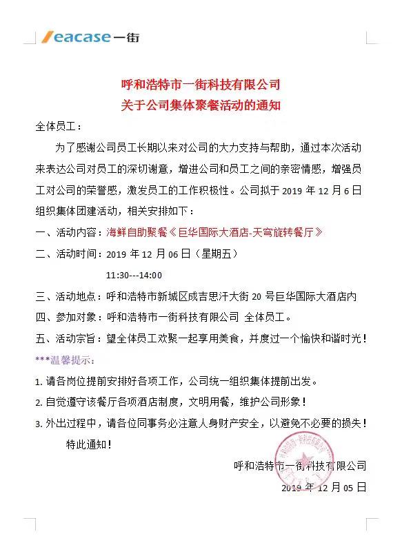 呼和浩特市數(shù)巢信息有限公司關(guān)于公司集體聚餐活動(dòng)的通知