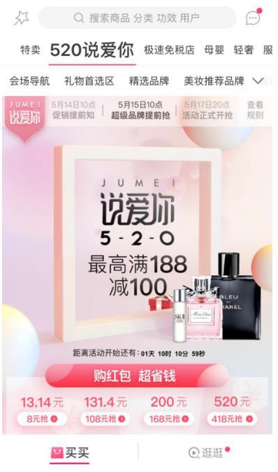 據(jù)了解,聚美優(yōu)品520大促活動自5月14日上午十點開啟預(yù)熱,至5月21日每天上午十點有超值紅包限量發(fā)放,數(shù)量有限,先搶先得。紅包共分四檔,最低有8元購買13.14元紅包,最高有418元購買520元紅包,由NINEPERCENT代言的簽名限定版香水售價即為520,使用紅包可為團(tuán)飯們大大節(jié)省。去聚美優(yōu)品APP給NINEPERCENT代言的I Do香榭之吻香水視頻點贊加評論,即抽2位用戶送520見面會門票和2瓶代言香水,另外再抽40名用戶送簽名海報。